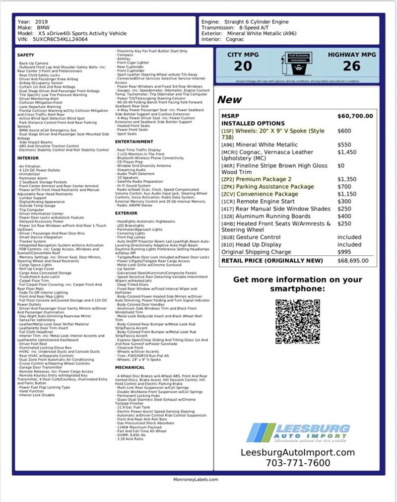 Mineral White Metallic 2019 BMW X5 xDrive40iAWD 3.0L I6 DOHC 24V TwinPower Turbo 8-Speed Automatic Safety inspected, Fully detailed, Cognac Leather.Awards: * 2019 KBB.com 10 Best Luxury SUVsBrowse our online inventory of pre-owned vehicles today and let us earn your business. If you're looking for the highest quality pre-owned vehicles. Contact us today at (703) 771-7600 or visit our website at www.LeesburgAutoImport.com. See website for terms and conditions. Financing Available for qualified buyers!!